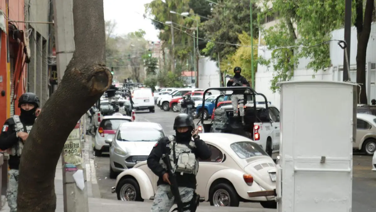 Personal de la Guardia Nacional mantiene acordonada las calles de Soto, Mina y Violeta, que convergen la institución perteneciente la FEMDO, esto en inmediaciones de la colonia Guerrero.