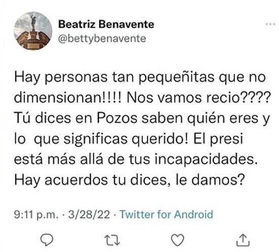 “Hay personas tan pequeñitas que no dimensionan! Nos vamos recio? Tú dices en Pozos saben quién eres y lo que significas querido! El presi está más allá de tus incapacidades. Hay acuerdos, tú dices, le damos?” publicó la funcionaria municipal en sus redes sociales, sin embargo, más tardó en redactarlo que en eliminarlo pues pa’ pronto se arrepintió, recapacitó y optó por borrarlo.
