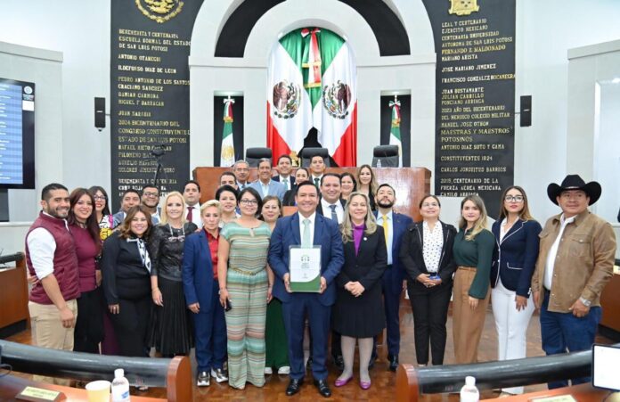 En sesión solemne del Congreso del Estado, y en cumplimiento con lo establecido por la Constitución local, el secretario general de Gobierno, J. Guadalupe Torres Sánchez, acudió al recinto Legislativo para entregar el 4º Informe de Resultados del Gobernador Ricardo Gallardo Cardona. El documento expone los principales avances del último año en rubros clave como obra pública, infraestructura, programas sociales y acciones en beneficio de las cuatro regiones del Estado.