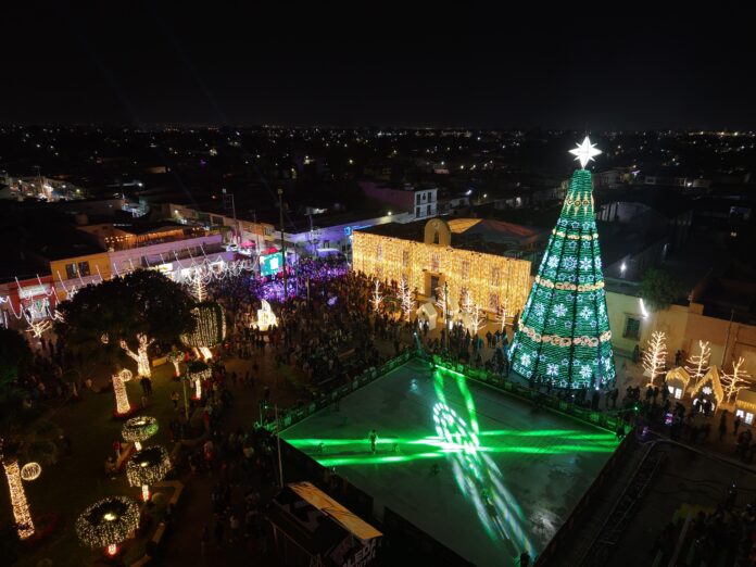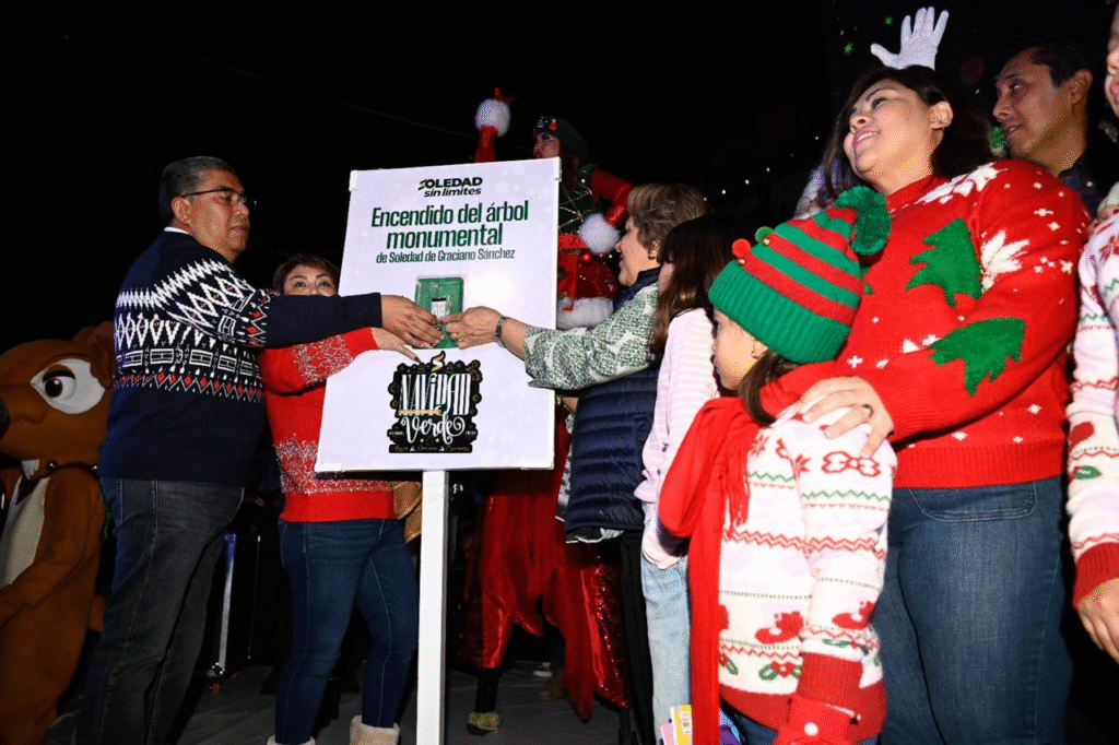 La magia de la Navidad iluminó esta noche el primer cuadro del municipio de Soledad de Graciano Sánchez, luego de que el Alcalde, Juan Manuel Navarro Muñiz realizó el encendido del Árbol monumental de Navidad y la inauguración de la Villa Navideña que rodea el jardín principal, una Pista de Hielo, así como del Nacimiento colocado en el patio del Ayuntamiento, dando inicio a las celebraciones navideñas 2025.