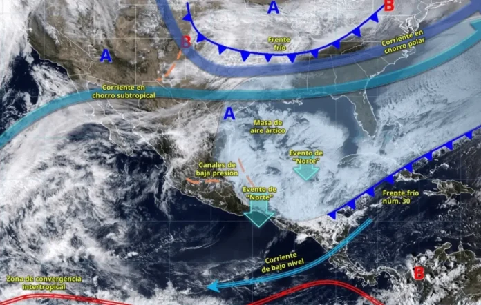 Una densa de masa de aire polar asociada al frente frío 32 continuó su desplazamiento sobre el territorio mexicano, amenazando con un drástico descenso térmico desde la frontera norte hasta el sureste del país.