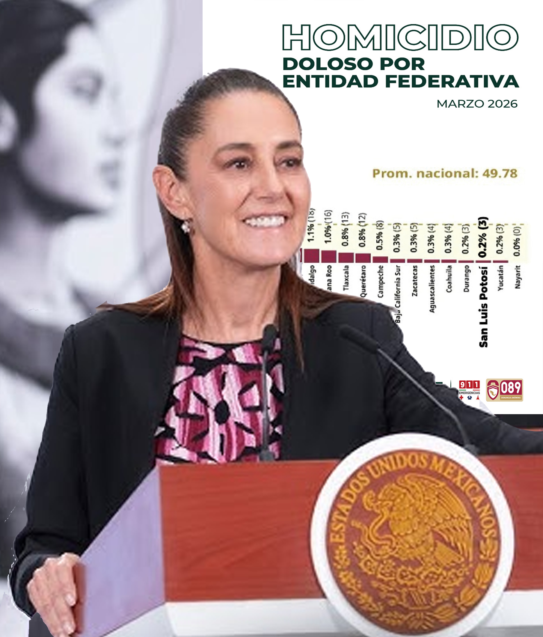 Como parte del impulso del Gobernador Ricardo Gallardo Cardona para fortalecer la seguridad en las cuatro regiones, San Luis Potosí se posicionó en marzo entre las entidades con menor incidencia de homicidio doloso del país, al ocupar el segundo lugar junto con Yucatán y Durango, con tres casos registrados, equivalentes al 0.2 por ciento del total nacional, de acuerdo con datos presentados en la conferencia matutina de la presidenta de México, Claudia Sheinbaum Pardo.