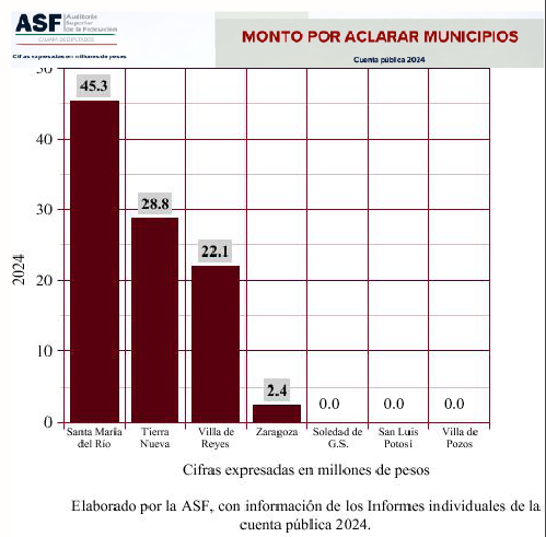 Según el reporte de la Auditoria Superior de la Federación las observaciones a al H. Ayuntamiento de Villa de Reyes, que es uno de los gobiernos municipales con más irregularidades del Estado, es de 12. 1 millones de pesos en su cuenta pública 2024. En el mismo periodo el Instituto de Fiscalización del Estado reportó a este municipio como uno de los que presentan mayor desastre financiero en detrimento de sus habitantes.