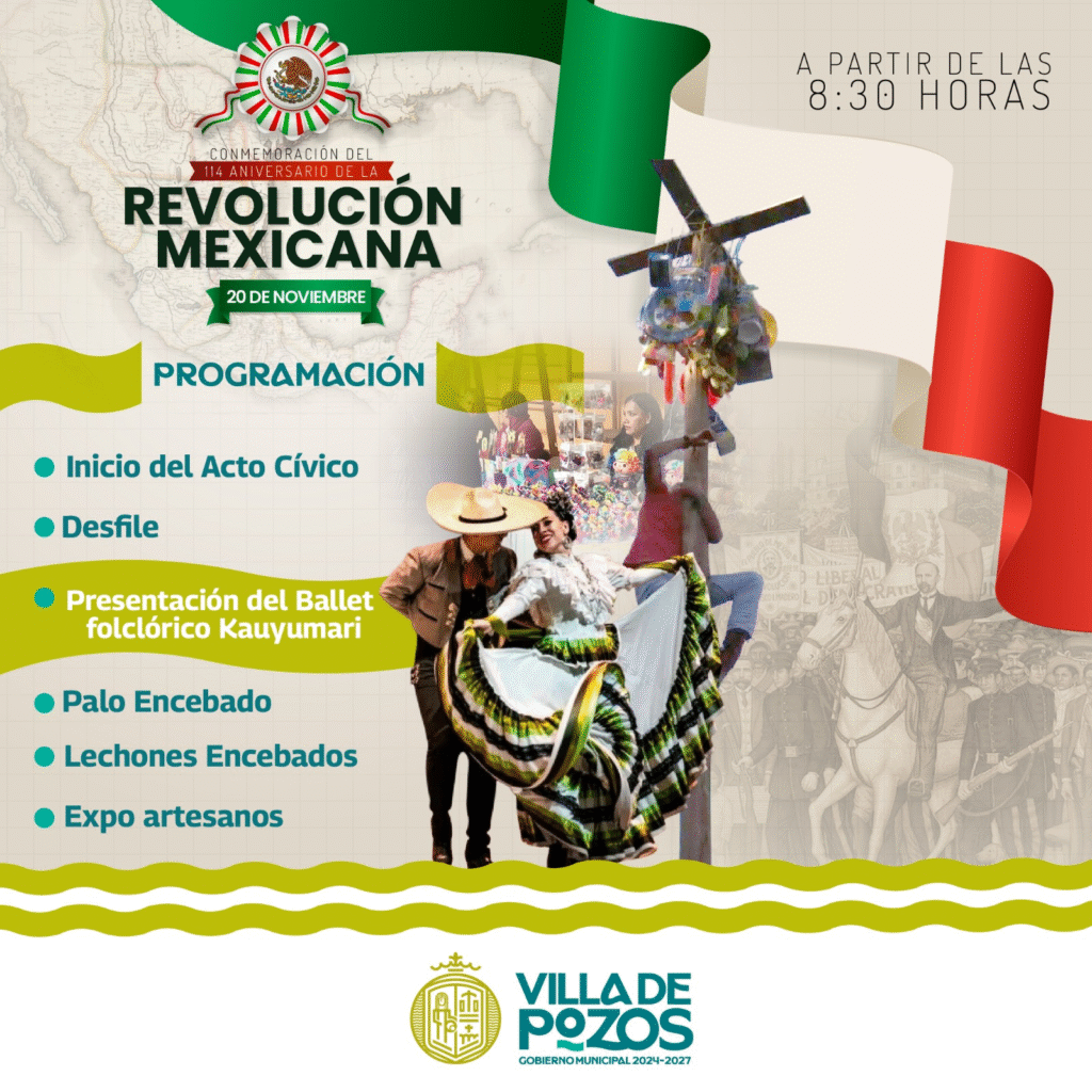 Las calles de Villa de Pozos se llenaron de color, música, tradición y orgullo con la celebración del CXV Aniversario de la Revolución Mexicana, en donde se realizó un desfile cívico militar encabezado por la Presidenta Concejal Martha Patricia Aradillas Aradillas que reunió a más de 1,300 estudiantes, 17 instituciones educativas, más de 250 deportistas, personal municipal y cientos de familias que se sumaron como espectadores.