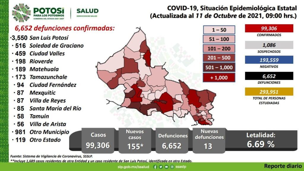 La Secretaría de Salud de San Luis Potosí y el Comité Estatal para la Seguridad en Salud, informan que, este martes 12 de octubre se confirmaron 155 nuevos contagios en las últimas 24 horas.