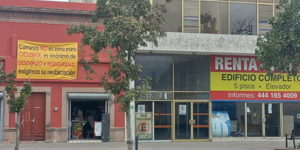 Carlos Torres, presidente de la Asociación Mexicana de Profesionales Inmobiliarios (AMPI), suplicó a las autoridades que rediseñen la movilidad en la avenida Carranza de la capital potosina, toda vez que, a consecuencia de la ciclovía, por lo menos 160 oficinas han cerrado y 70 locales comerciales están abandonados porque nadie los renta.