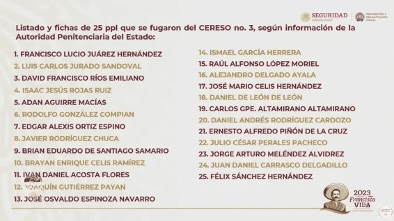 Una lista con los 25 nombres de las personas fugadas fue dada conocer por la funcionaria federal, al tiempo de asegurar que se continúa con la búsqueda del resto de prófugos.
