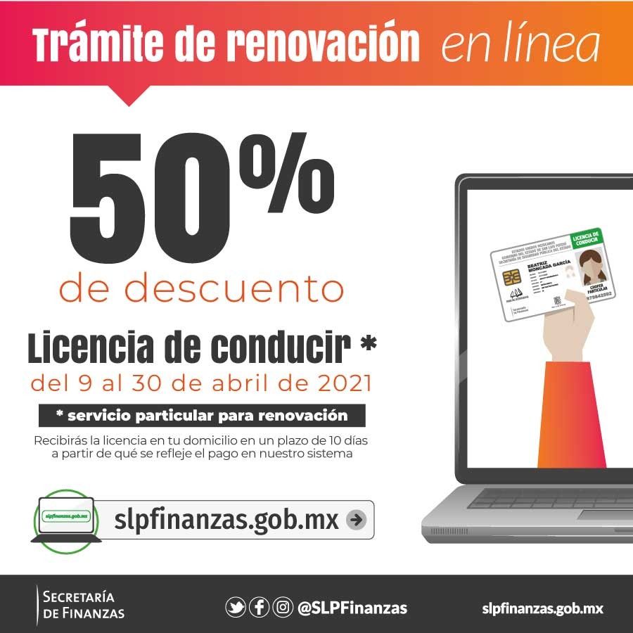 La Secretaría de Finanzas (SEFIN) lleva a cabo el programa de descuentos en licencias de conducir con un 50% en renovación a través del portal web www.slpfinanzas.gob.mx. La dependencia fortaleció el sistema de atención en esta herramienta digital para que la ciudadanía pueda realizar de manera más sencilla el pago por esta vía.