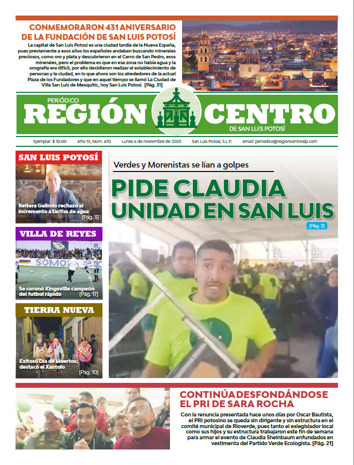 CONMEMORARON 431 ANIVERSARIO DE LA FUNDACIÓN DE SAN LUIS POTOSÍ. VERDES Y MORENISTAS SE LIAN A GOLPÉS, PIDE CLAUDIA UNIDAD EN SAN LUIS. CONTINÚA DESFONDÁNDOSE EL PRI DE SARA ROCHA. Reitera Galindo rechazo al incremento a tarifas de agua. Se coronó Kingsville campeón del futbol rápido. Exitoso Día de Muertos; destacó el Xantolo.