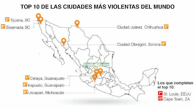 En la presentación del informe, la organización advirtió que de las 10 ciudades más violentas del mundo 7 son mexicanas: Celaya (Guanajuato) en el primer lugar, Tijuana (Baja California) en el segundo, Ciudad Juárez (Chihuahua) en el tercero, Ciudad Obregón (Sonora) en el cuarto, Irapuato (Guanajuato) en el quinto, Ensenada (Baja California) en el sexto y Uruapan (Michoacán) en el octavo.PUBLICIDAD