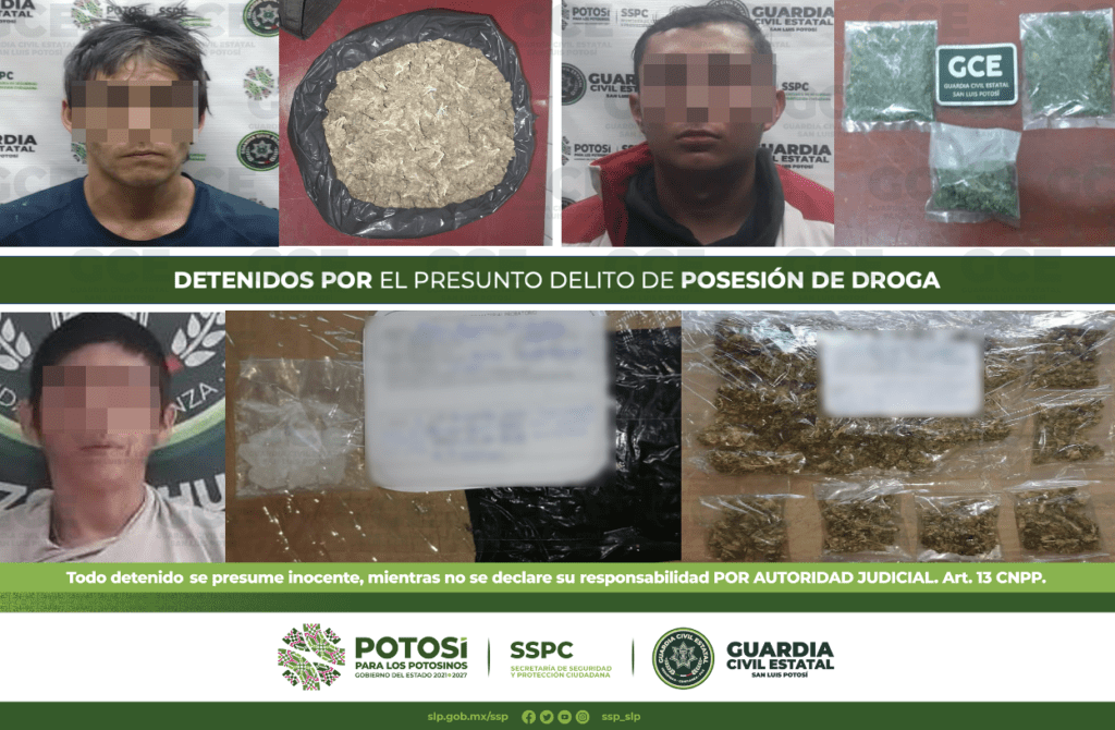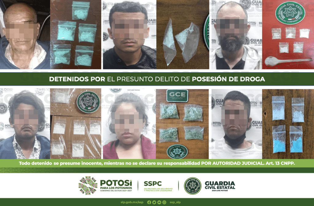 S.L.P.- Gracias a labores de seguridad y vigilancia desplegadas para inhibir conductas que vulneren la integridad de la ciudadanía, agentes de la Guardia Civil Estatal (GCE) detuvieron a 9 personas por presuntos delitos contra la salud en su modalidad de posesión de droga.