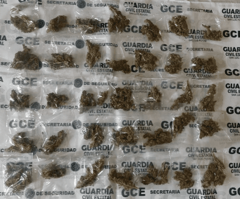 Por último, en el municipio de Charcas, sobre las calles de Pino Suárez e Insurgentes, en el Barrio La Luz, agentes de la GCE aseguraron aproximadamente 180 gramos de marihuana distribuidos en 35 bolsas plásticas.