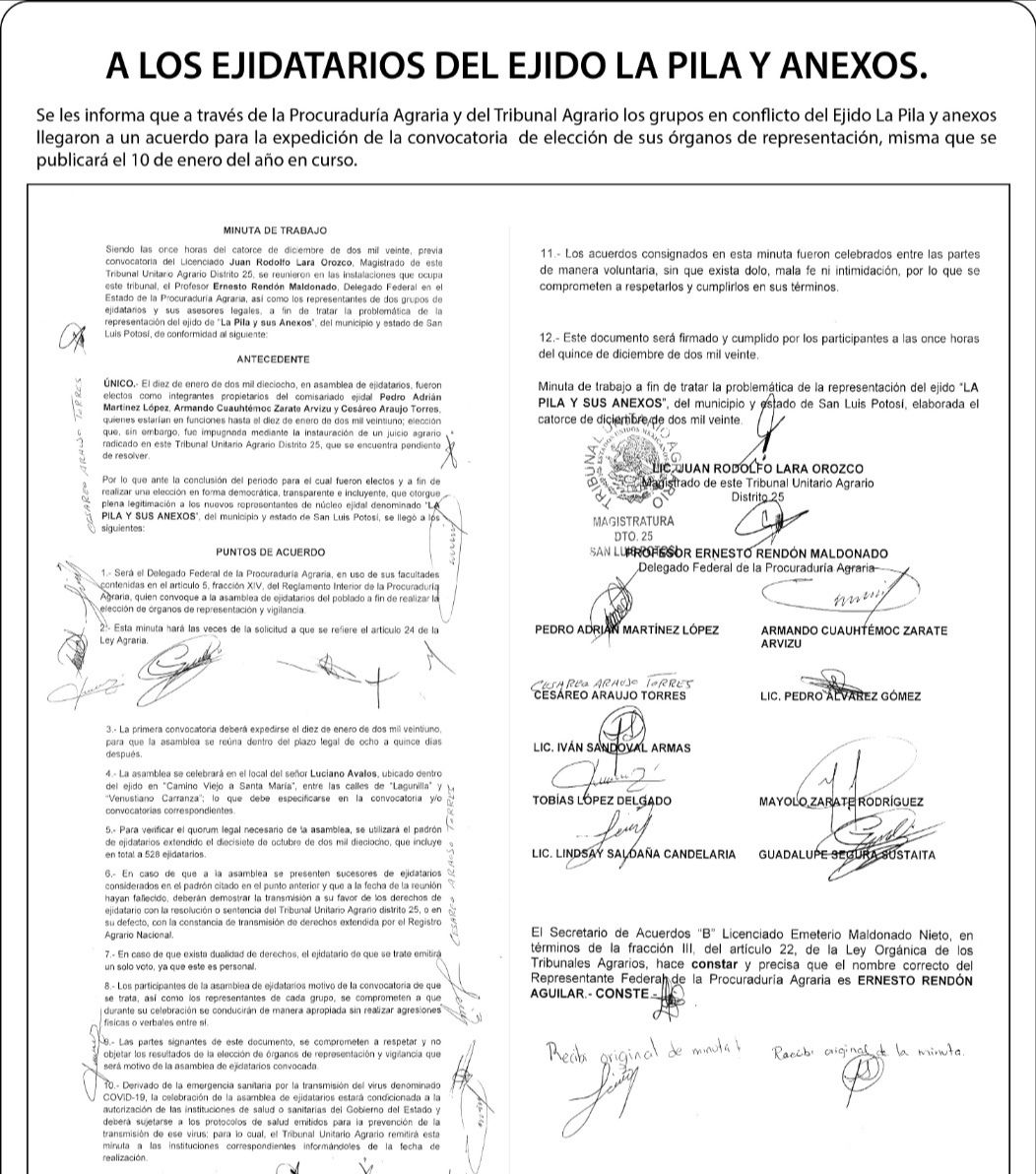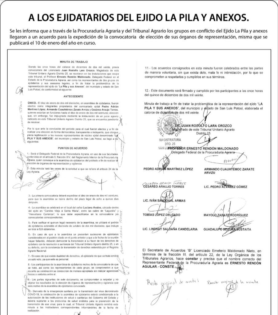 Entre los firmantes se encuentran el Magistrado del Tribunal Unitario Agrario Distrito 25 Juan Rodolfo Lara Orozco, el Delegado Federal de la Procuraduría Agraria Ernesto Rendón Maldonado. También forman Mayolo Zarate Rodríguez, Tobías López Delgado, Iván Sandoval Armas, Lindsay Saldaña Candelaria así como quienes se ostentan como Comisariado Ejidal.