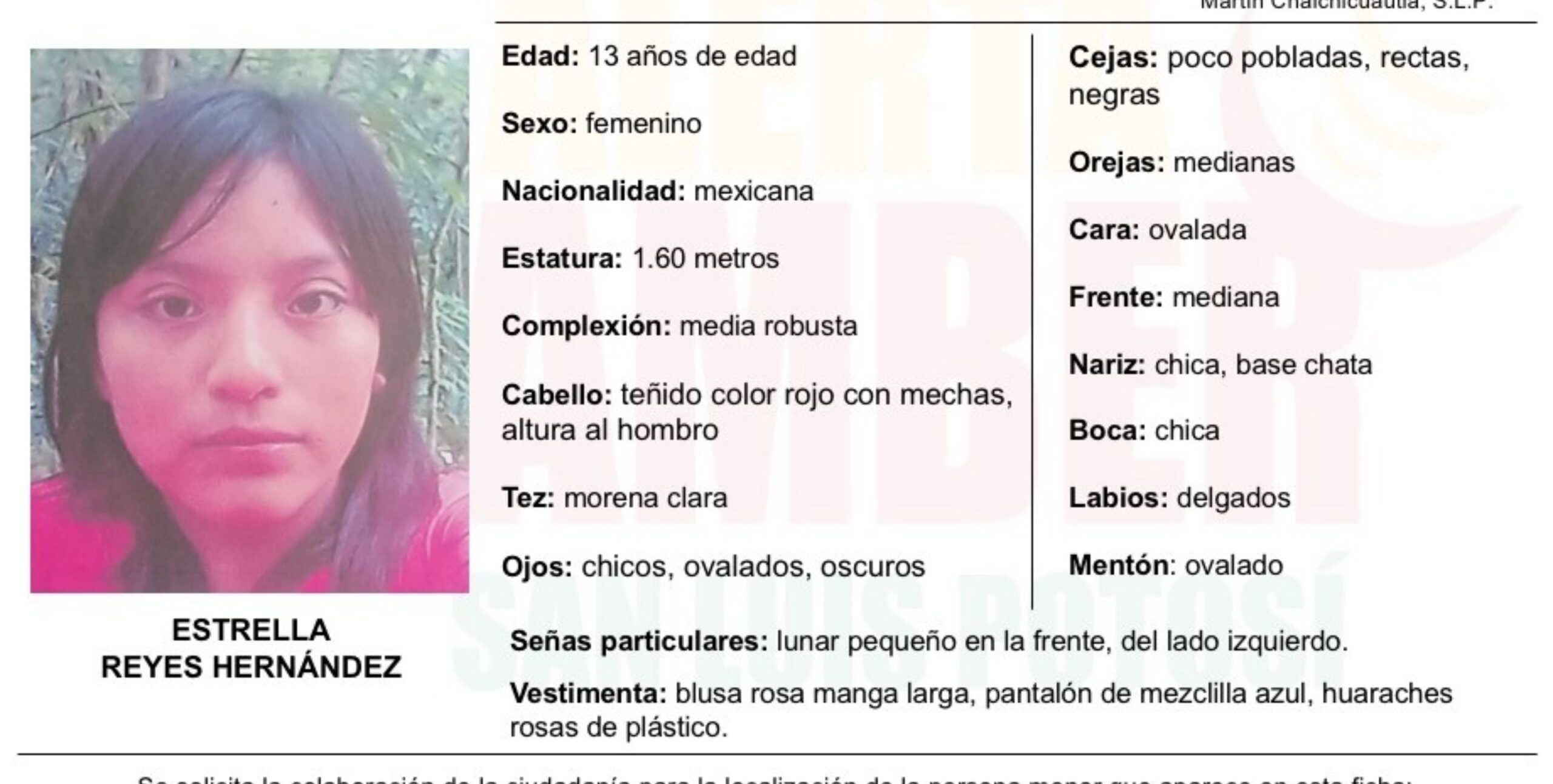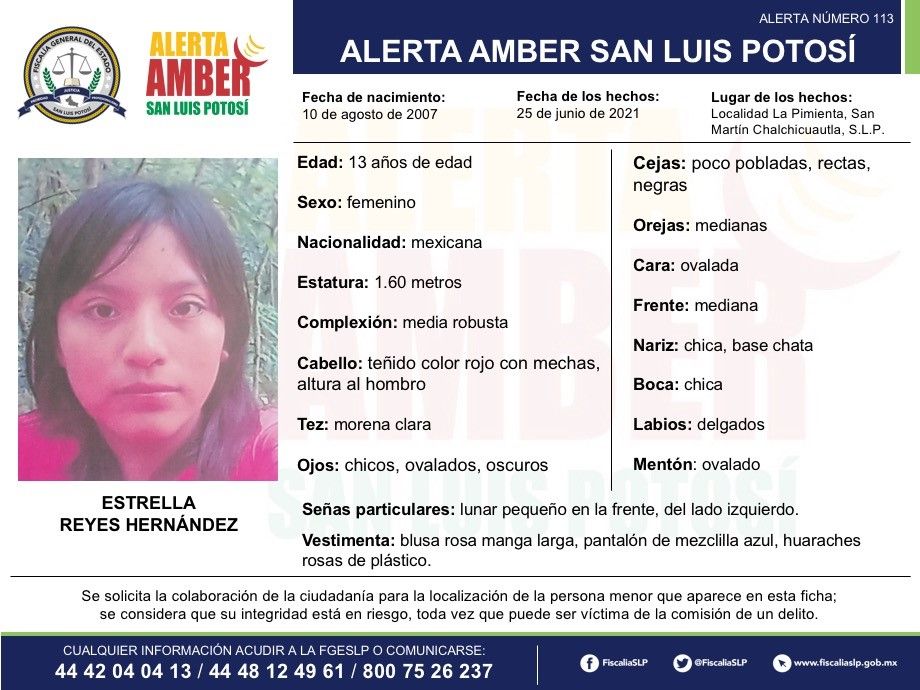 La Fiscalía General del Estado activó una Alerta Amber, para la localización de una menor de 13 años de edad, de nombre Estrella Reyes Hernández quien fue vista por última vez en la comunidad La Pimienta, perteneciente al municipio de San Martín Chalchicuautla.