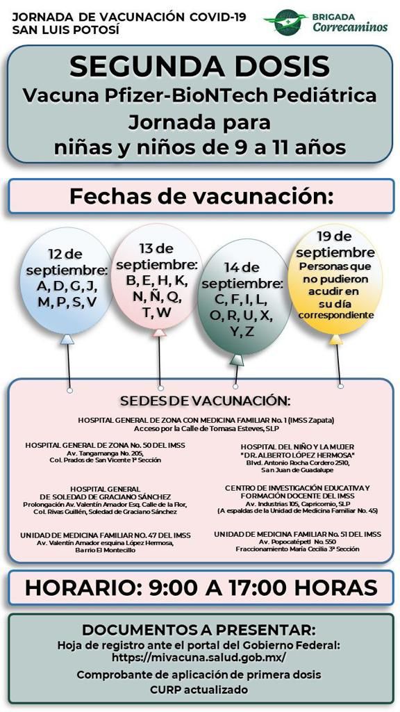 El Comité Estatal de Vacunación contra Covid-19 dio a conocer que vacunará a niñas y niños de nueve a 11 años de edad los días 12,13, 14 y 19 de septiembre, para lo que será necesario presentar su hoja de registro del portal https://mivacuna.salud.gob.mx, CURP actualizada, comprobante de primera dosis y acudir en compañía de una persona adulta.