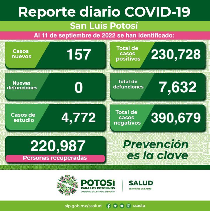 No se registran nuevas defunciones, por lo que la cifra de muertes en el Estado se mantiene en siete mil 632. Sobre los estudios de nuevos casos, 81 son mujeres y 76 hombres en un rango de edad de siete meses a 81 años. Para este día, se encuentran hospitalizadas siete personas, de las cuales ninguna requiere de respiración asistida.