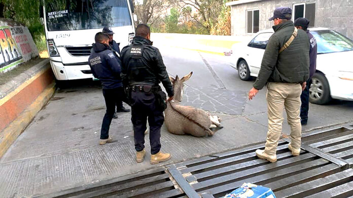 SANTA MARÍA DEL RÍO, S. L. P. – La mañana del martes, a la comandancia de la Dirección General de Seguridad Pública y Policía Vial Municipal algunas personas reportaron que un burro había caído en una rejilla de la alcantarilla que se localiza en la calle Primo Feliciano Velázquez, cerca del puente. De inmediato se organizaron agentes policiales y se trasladaron al lugar donde se requería su intervención.