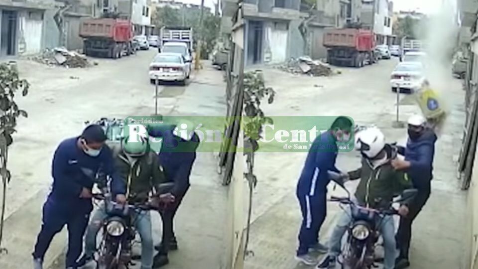 La cámara de seguridad logró captar cómo un motociclista estaba a un costado de la acera, revisando su celular, cuando de pronto un mototaxi se aproxima y descienden dos hombres armados. De inmediato lo comienzan a despojar de sus pertenencias.