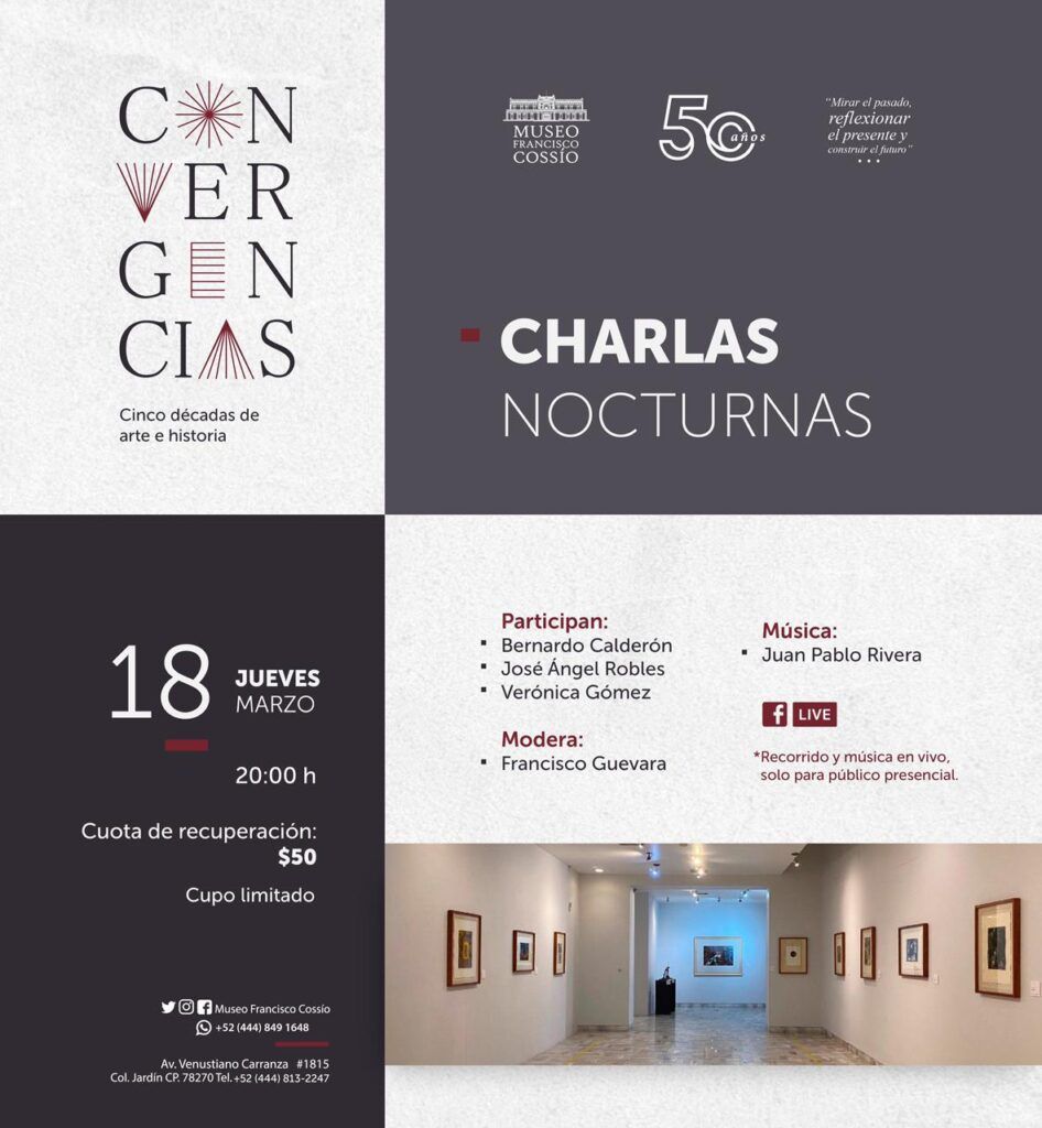 El jueves 18 de marzo a las 20:00 h se llevarán a cabo las “Charlas Nocturnas”, en donde se estarán presentando tres de los artistas participantes en la exposición “Convergencias. Cinco décadas de arte e historia”, Bernardo Calderón, José Ángel Robles y Verónica Gómez, bajo la moderación de Francisco Guevara, en torno a la evolución del arte en San Luis Potosí durante los últimos 50 años. Además se mencionarán las instituciones de educación y difusión artística, así como los maestros, maestras y artistas potosinas. Los y las artistas invitadas compartirán su trayectoria y su experiencia participando en este Museo a lo largo de este tiempo.