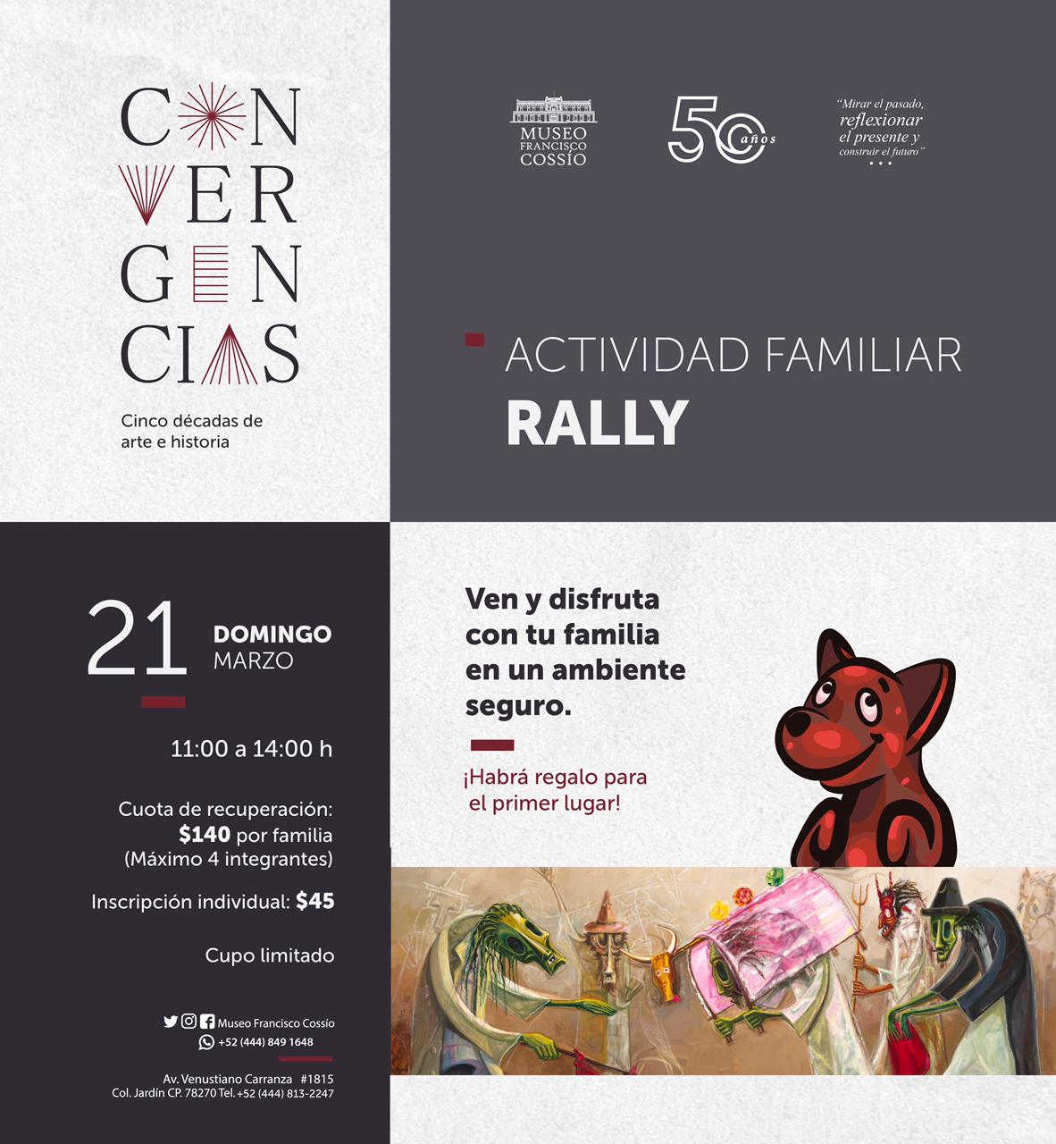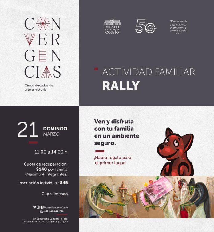 El domingo 21 de marzo de 11:00 a 14:00 h, se llevará a cabo el Rally “Convergencias. Cinco décadas de arte e historia”. El contenido del rally está relacionado con la exposición temporal, por lo que es necesario acudir al museo el domingo 21 de marzo y visitar las diferentes salas de exhibición. La cuota de recuperación es de $140 por familia, con un máximo 4 integrantes, o se puede participar individualmente con un costo de $45.