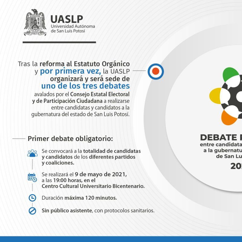 La UASLP será sede del primer debate electoral entre candidatos a la gubernatura de SLP. El Consejo Estatal Electoral avaló tres encuentros los cuales se llevarán a cabo el 9, 14 y 28 de mayo.