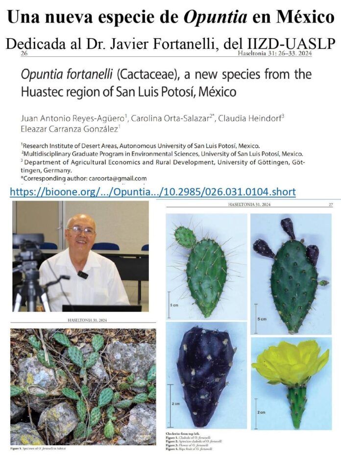 La Universidad Autónoma de San Luis Potosí (UASLP) ha sumado un importante hallazgo a la ciencia botánica mundial: la descripción de una nueva especie de nopal, denominada Opuntia Fortanelli, en honor al botánico universitario doctor Javier Fortanelli Martínez. La nueva especie fue descubierta por el doctor Juan Antonio Reyes Agüero, director del Jardín Botánico “El Izotal” de la UASLP, en la Sierra del Abra Tanchipa, una reserva de la biosfera ubicada al norte de Ciudad Valles, San Luis Potosí.