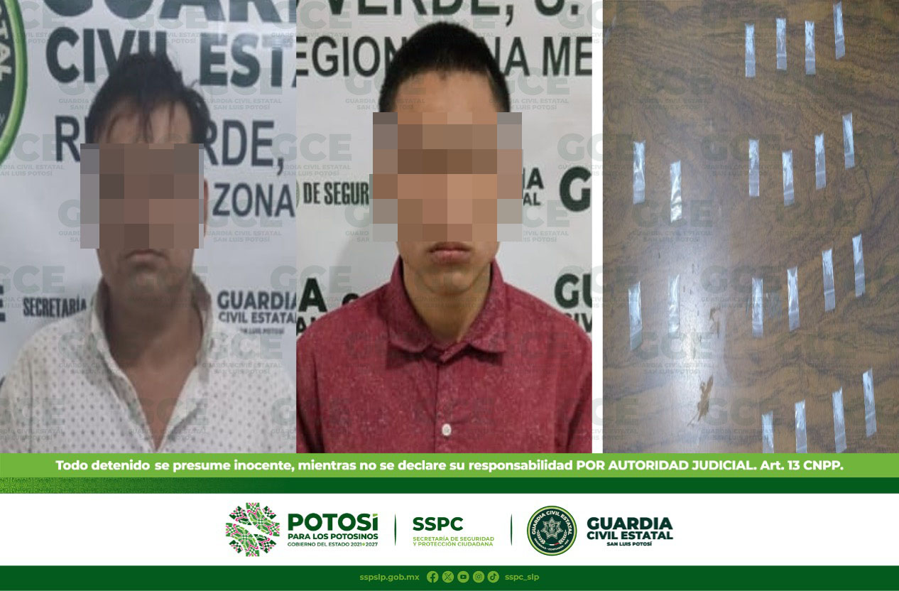 Como resultado de los trabajos operativos aéreos y terrestres, efectuados por agentes de Guardia Civil Estatal (GCE) en la zona Huasteca, dos presuntos narcomenudistas, miembros de la delincuencia, fueron capturados, tras asegurarles dosis de la droga sintética “cristal”.