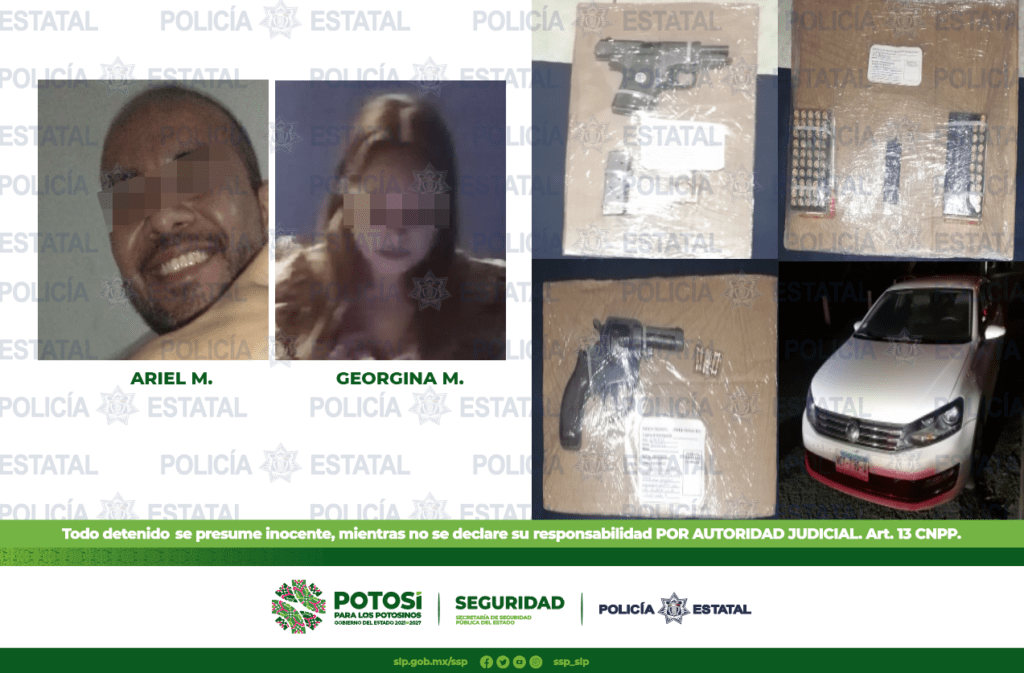 01 Pistola marca Mustang Poklitle, abastecida con 4 cartuchos calibre. 380, 01 cargador vacío y 68 cartuchos .380, marca Águila, así como 01 Revolver calibre .22 abastecida con 06 cartuchos útiles, se les asegura también 01 vehículo marca Vento, color blanco, modelo 2016, con placas de S.L.P sin reporte de robo.