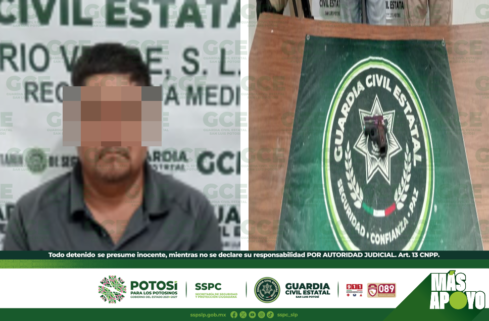 RIOVERDE. – Una alerta ciudadana, sobre la presencia de una persona armada, en la comunidad de Santa Rita, movilizó a los elementos de la Guardia Civil Estatal (GCE), quienes detuvieron en el lugar a una persona, señalada del presunto delito de amenazas; se le aseguró un arma de fuego.