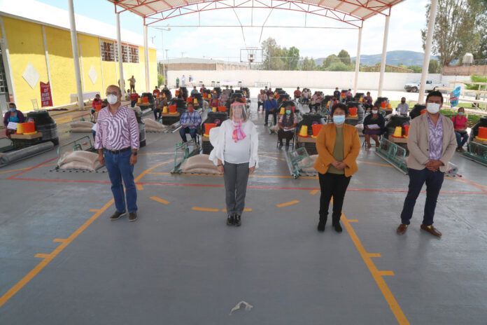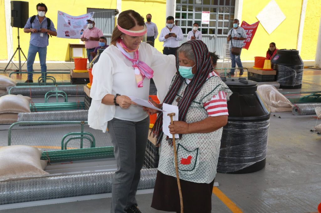 Al iniciar sus actividades en la cabecera municipal, estuvo con representantes de las familias beneficiadas para entregarles el equipamiento de las granjas avícolas de traspatio, apoyo que les permitirá producir huevo orgánico para el consumo en el hogar, así como un ingreso al vender el excedente.