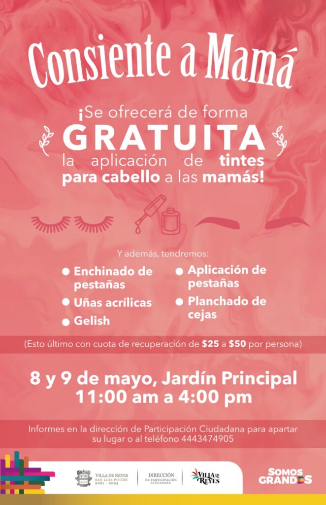 En el caso de la dirección de Participación Ciudadana que llevará a cabo la actividad “Consiente a Mamá”, se ofrecerá la aplicación de tintes para cabello de forma gratuita a las mamás, además se ofrecerá enchinado de pestañas, aplicación de pestañas, planchado de cejas, uñas acrílicas y gelish, aunque esto último tendrá una cuota de recuperación de 25 a 50 pesos por persona.