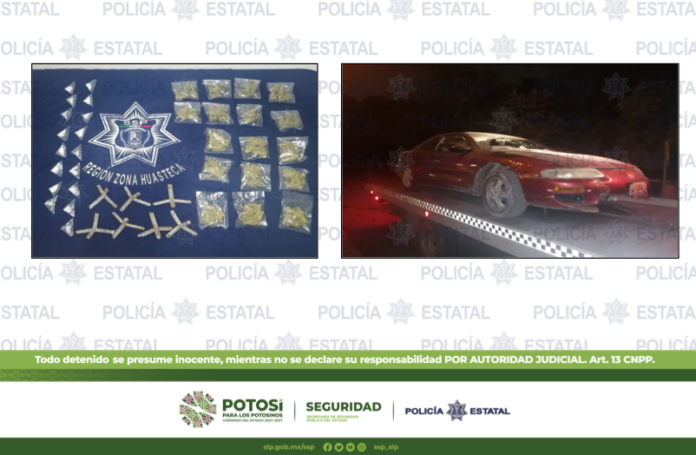 CIUDAD VALLES, SLP. – En el marco de los patrullajes realizados en la región Huasteca, agentes Estatales aseguraron en calidad de abandonado un automotor, así como droga y varios “poncha llantas”.