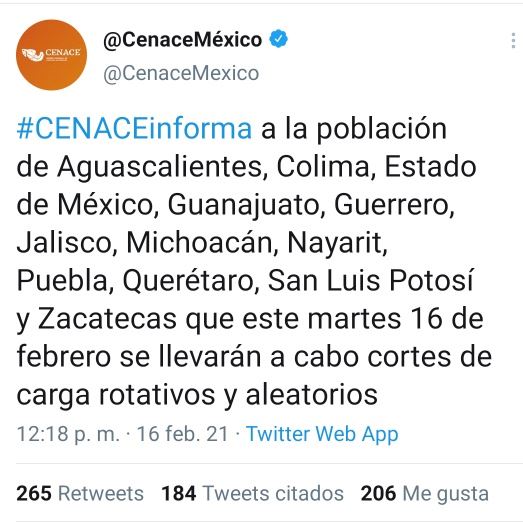 “#CENACEinforma a la población de Aguascalientes, Colima, Estado de México, Guanajuato, Guerrero, Jalisco, Michoacán, Nayarit, Puebla, Querétaro, San Luis Potosí y Zacatecas que este martes 16 de febrero se llevarán a cabo cortes de carga rotativos y aleatorios”.