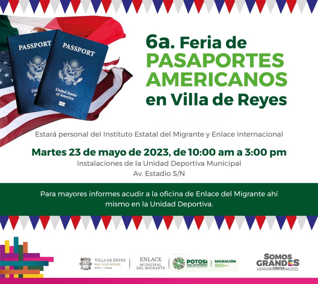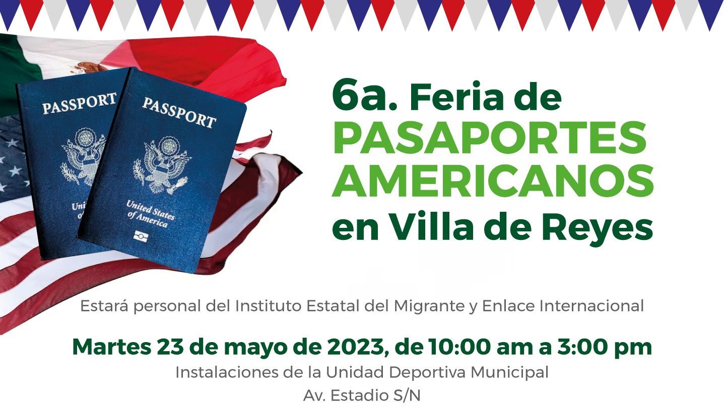 VILLA DE REYES. – El Enlace Municipal del Migrante de Villa de Reyes, invita a participar en la Sexta Feria del Pasaporte Americano que organiza el Instituto Estatal de Migración y Enlace Internacional que se llevará a cabo el próximo martes 23 de mayo de 10:00 a 15:00 horas en las instalaciones de la Unidad Deportiva Municipal.