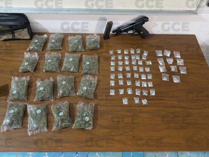 La intervención se llevó a cabo en un domicilio particular, donde las autoridades lograron asegurar un arma corta calibre 9 milímetros, 46 dosis de la droga conocida como cristal y 16 bolsas con marihuana.