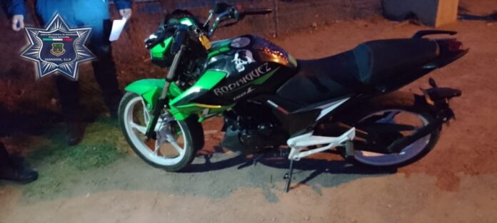 ZARAGOZA, S. L. P. – Una motocicleta, la cual cuenta con reporte de robo con violencia, de hecho, fue en un asalto, fue recuperada por agentes de la Dirección General de Seguridad Pública y Policía Vial Municipal de Zaragoza, la tripulaba un adolescente, el cual fue asegurado por los uniformados y puesto, junto con el vehículo ligero, a disposición de la Agencia del Ministerio Público de la Fiscalía General del Estado.