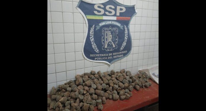 En recorridos de prevención y vigilancia sobre la Carretera Estatal Salinas de Hidalgo-Santo Domingo kilómetro 29, perteneciente a la comunidad de Yoliatl, Salinas de Hidalgo, se realiza el decomiso de la mencionada cantidad de peyote con un peso de 110 kilogramos distribuidos en cinco costales, la cual trasladaban en una camioneta Dodge Durango 1998, placas del Estado de Nayarit con destino a Real de Catorce, S.L.P.