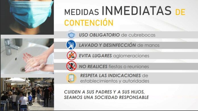 Por lo que se reiteró la importancia del uso obligatorio de cubrebocas en espacios abiertos y cerrados; el lavado y desinfección de manos; evitar lugares con aglomeraciones, ya sean públicos o privados: no llevar a cabo fiestas o reuniones y, ante todo, respetar las indicaciones de establecimientos y de las autoridades de salud, son las medidas que de forma instantánea deben aplicarse para contrarrestar el avance del virus.