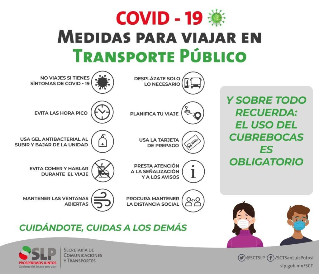 La Secretaría de Comunicaciones y Transportes (SCT), exhorta a la población a extremar las medidas sanitarias al hacer uso del servicio de transporte público, para evitar contagios por COVID-19, dando así seguimiento a las recomendaciones emitidas por la Secretaría de Salud del Estado.