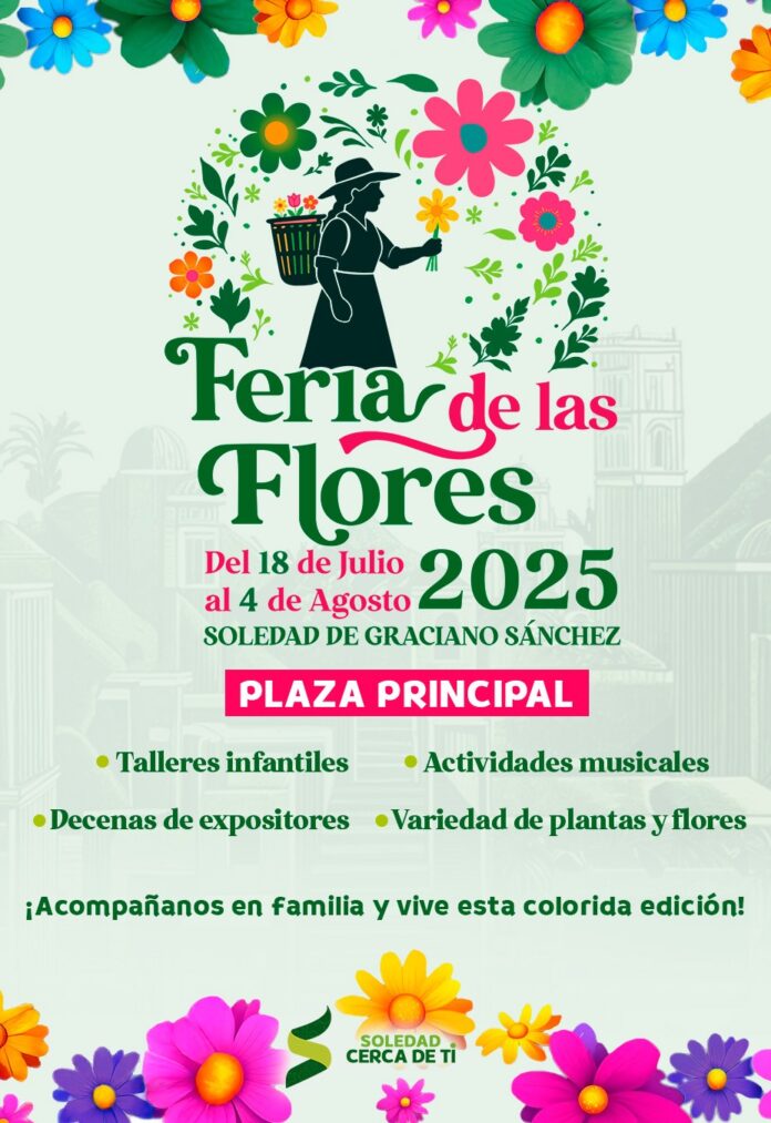 Con grandes atractivos, talleres y expositores de diferentes estados del país y del estado, este próximo viernes 18 de julio, comienza la Feria de las Flores 2025 en Soledad de Graciano Sánchez impulsada por el Gobierno Municipal liderado por el Alcalde Juan Manuel Navarro Muñiz, la cual se desarrollará en la Plaza principal, con un atractivo programa de actividades culturales y una variedad de productos.