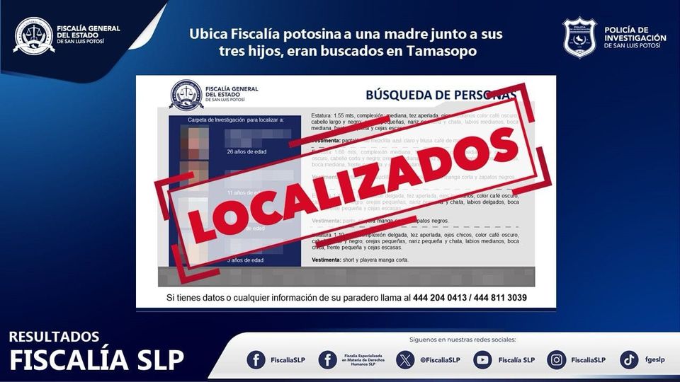 La Fiscalía General del Estado de San Luis Potosí informa que como resultado de los trabajos que implementa la Dirección General de Métodos de Investigación, se ubicó a cuatro personas que tenían ficha de búsqueda en la Huasteca potosina.
