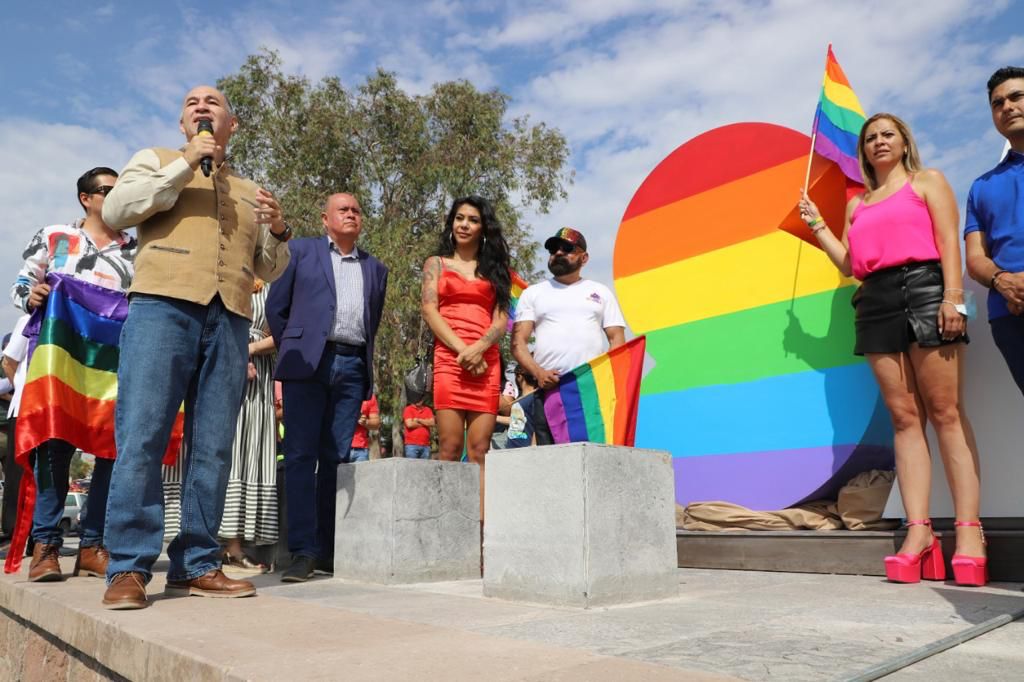 El alcalde Enrique Galindo Ceballos develó este sábado las letras monumentales en la asta bandera de la avenida Manuel Nava, como parte del programa “Expresión San Luis”, que hoy muestra los colores del arcoíris que representa a la comunidad LGBTIQ+.