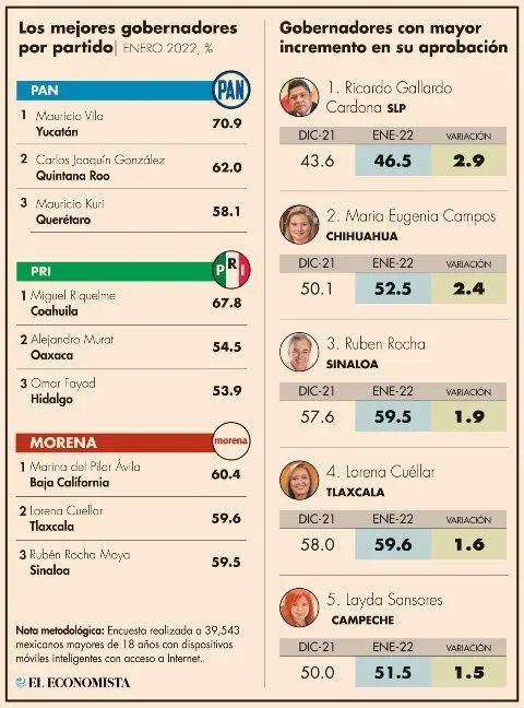 De acuerdo al sondeo, realizado por el diario El Economista, de diciembre de 2021 a enero 2022, Gallardo Cardona obtuvo 2.9 por ciento más de aprobación, superando a la gobernadora de Chihuahua María Eugenia Campos, quien obtuvo 2.4 por ciento en ese mismo periodo; Rubén Rocha, de Sinaloa, con 1.9 por ciento; Lorena Cuéllar, de Tlaxcala con 1.6 por ciento y Layda Sansores, gobernadora de Campeche, quien obtuvo 1.3 por ciento más de aprobación.