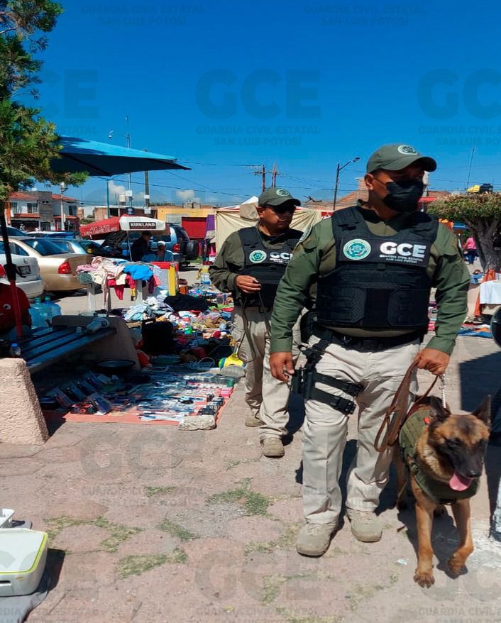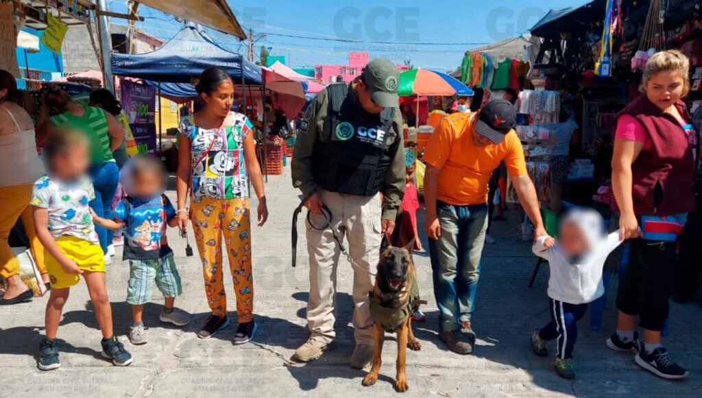 Cada semana, integrantes de la GCE y canes entrenados visitan mercados ambulantes, tianguis y sitios públicos donde se concentra gran afluencia de personas. Esta ocasión, el Agrupamiento hace presencia persuasiva contra la comisión de hechos delictivos en la zona sur de la ciudad capital.