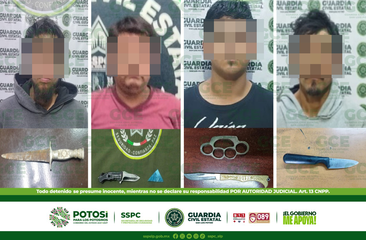 Como parte de la aplicación del Plan Integral de Seguridad que se aplica en las cuatro regiones del estado potosino, elementos estatales, detuvieron a personas que llevaban consigo una daga, un cuchillo, dos navajas y un “bóxer”.