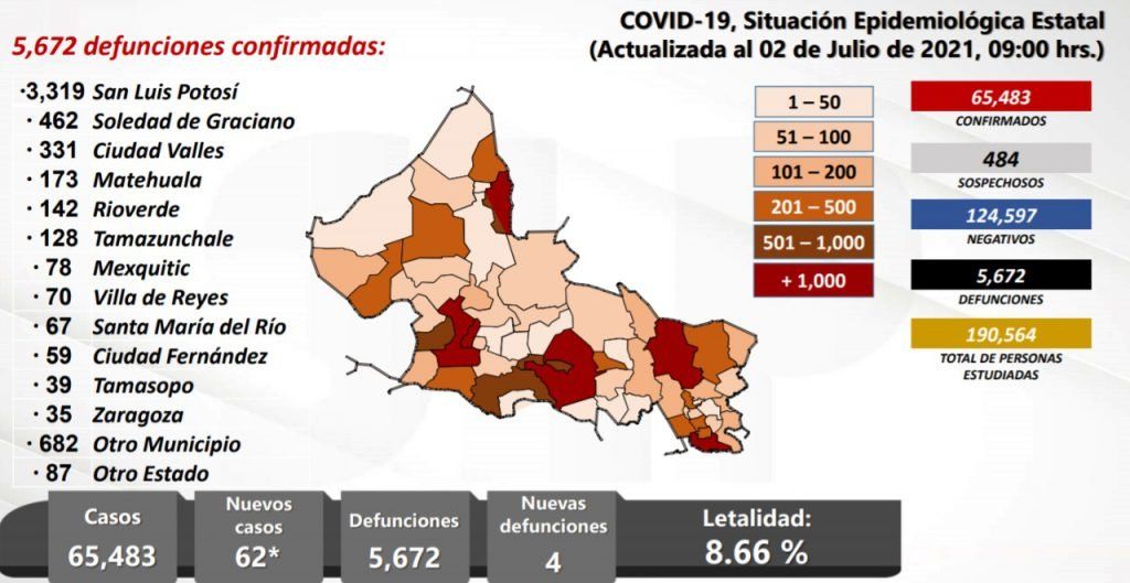 La entidad potosina presentó 62 casos positivos de Covid 19, además de cuatro muertes, en el reporte de este sábado de la Secretaría de Salud Estatal, estadísticas que ya acumulan 5,672 fallecimientos y 65,483 pacientes contagiados, con una letalidad estatal de 8.66 por ciento.