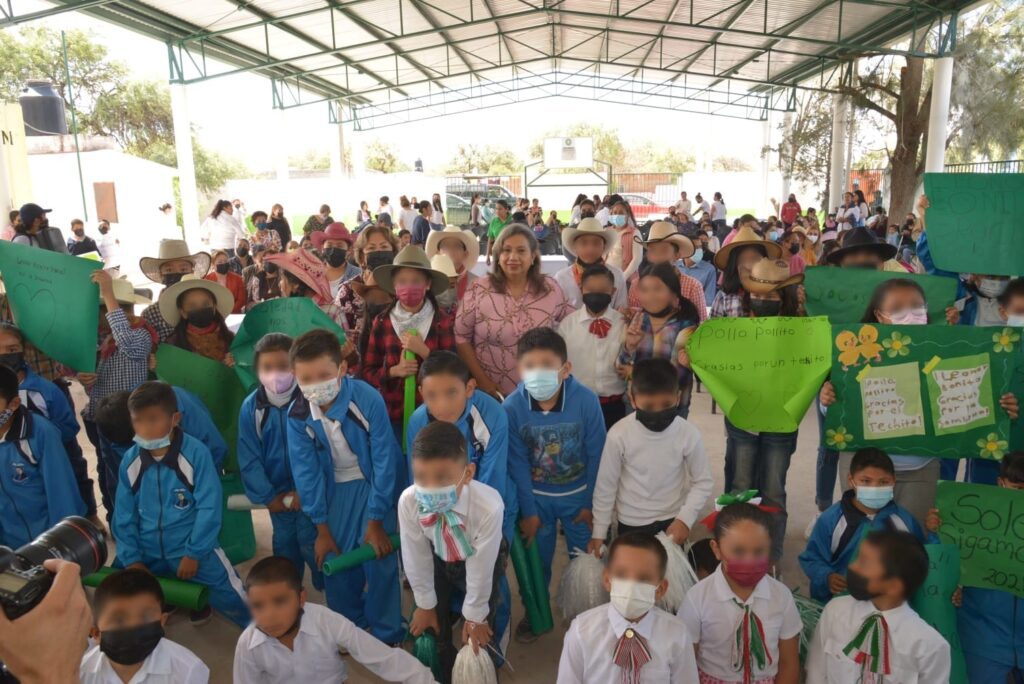 La alcaldesa de Soledad de Graciano Sánchez, Leonor Noyola Cervantes, inauguró este miércoles el techado del patio cívico de la escuela primaria rural Álvaro Obregón, ubicada en la comunidad de la Tinaja.