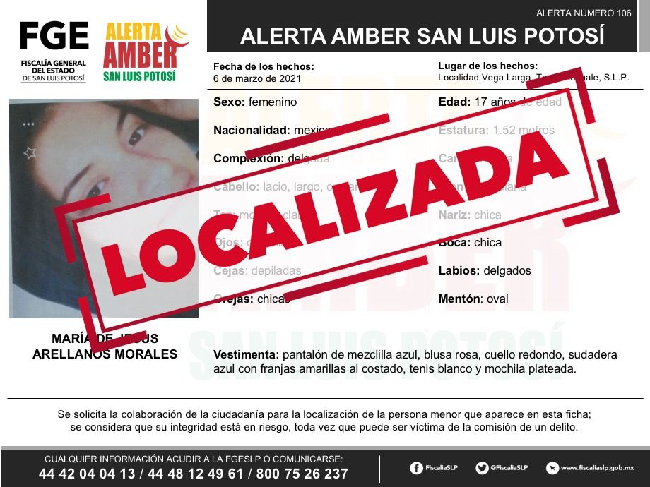 SLP. – Fue localizada sana y salva, la menor de nombre María de Jesús Arellanos Morales, por quien se activó una Alerta Amber para su localización desde el pasado 9 de marzo de 2021, informó la Fiscalía General del Estado de San Luis Potosí (FGESLP).