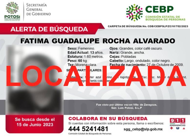 Fue atendido el reporte de una madre de familia, quien narró que su hija de 13 años de edad había salido de la casa por la mañana en la Unidad Habitacional Prados de San Vicente, segunda sección, en la delegación de Villa de Pozos, para dirigirse a la escuela, a donde luego fue reportado que no llegó.