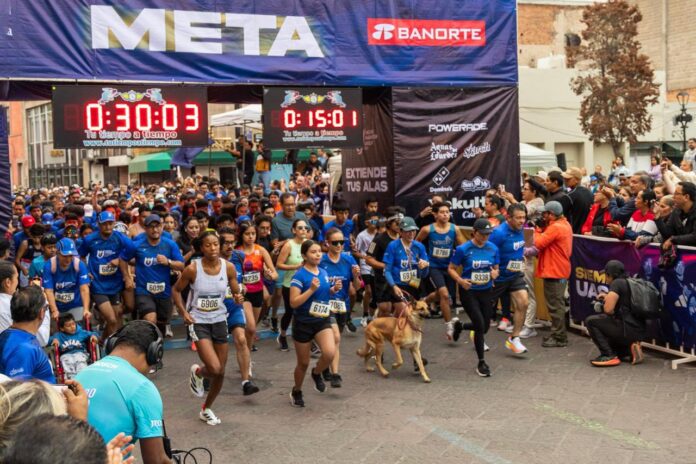 La capital potosina amaneció vestida de azul y entusiasmo con la realización del Medio Maratón de la Universidad Autónoma de San Luis Potosí (UASLP) 2025, que este domingo 28 de septiembre reunió a más de 12 mil corredores en un encuentro que combinó identidad universitaria, convivencia familiar y unión ciudadana.